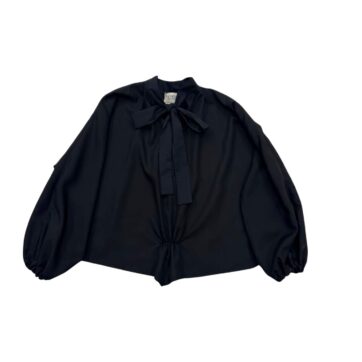 This blouse is crafted from 100% Tencel and features dropped shoulders and long ties that allow for multiple styling options. Its wide sleeves and subtle asymmetric hem enhance the fluid silhouette, while the V-shaped neckline adds the perfect finishing touch.