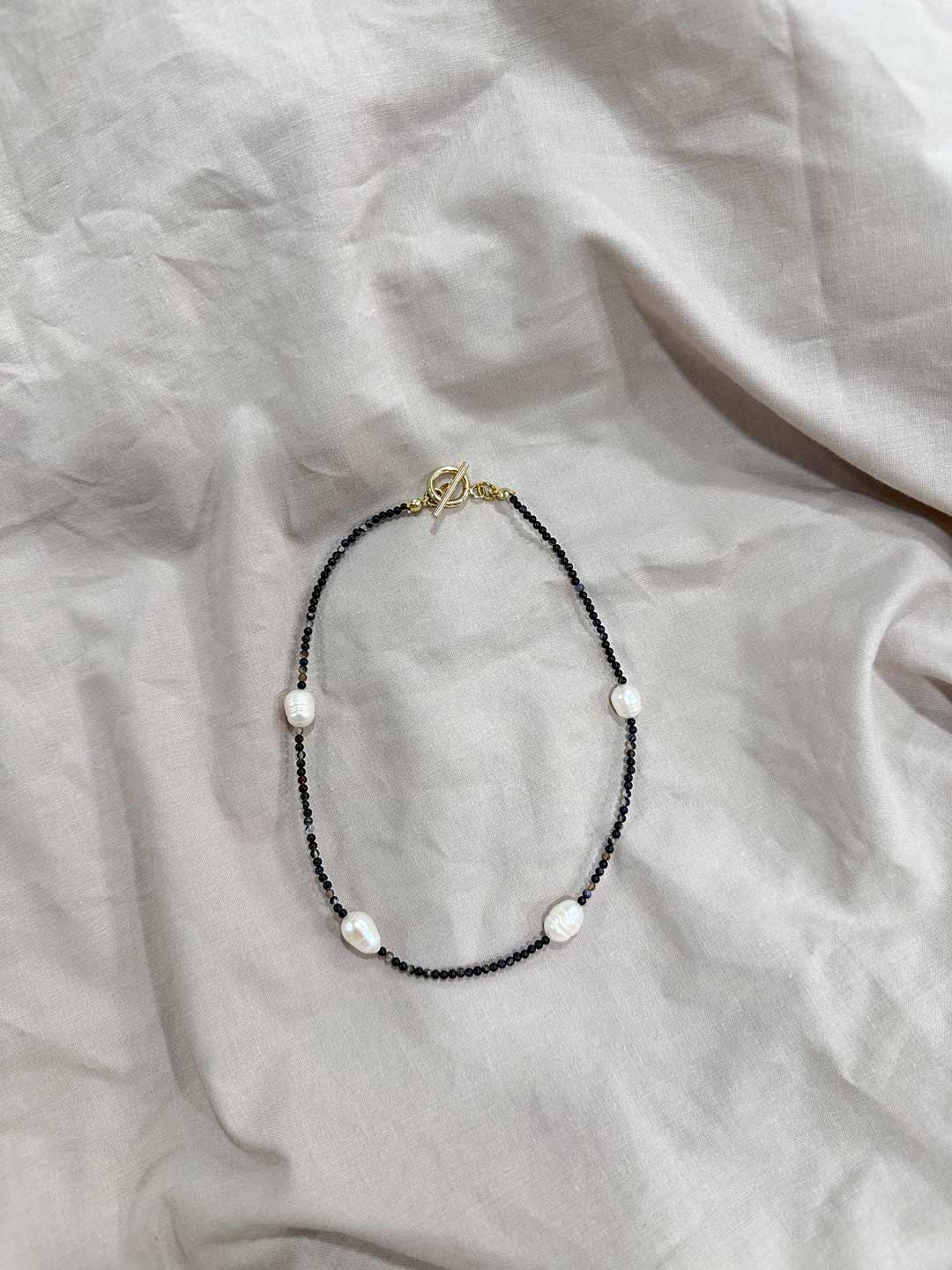 Collar elaborado con piedras de Ónix y perlas de aguadulce. Incorpora un cierre dorado de acero inoxidable.