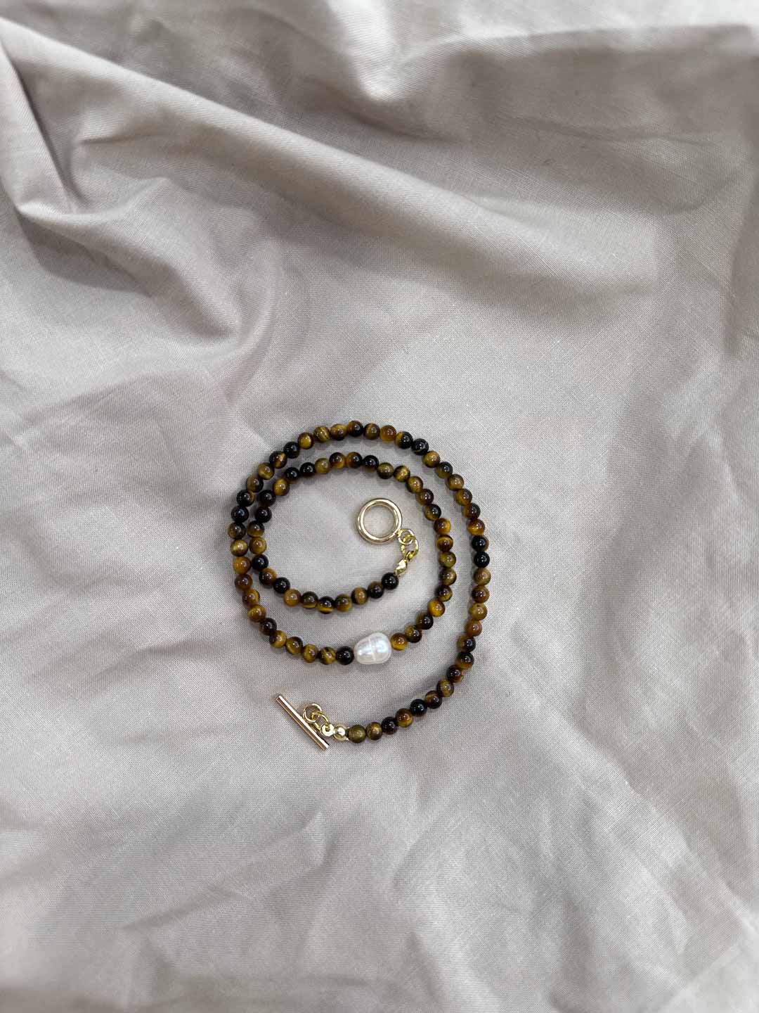 Collar elaborado con piedras de tiger eye y perla de aguadulce. Incorpora un cierre dorado de acero inoxidable.